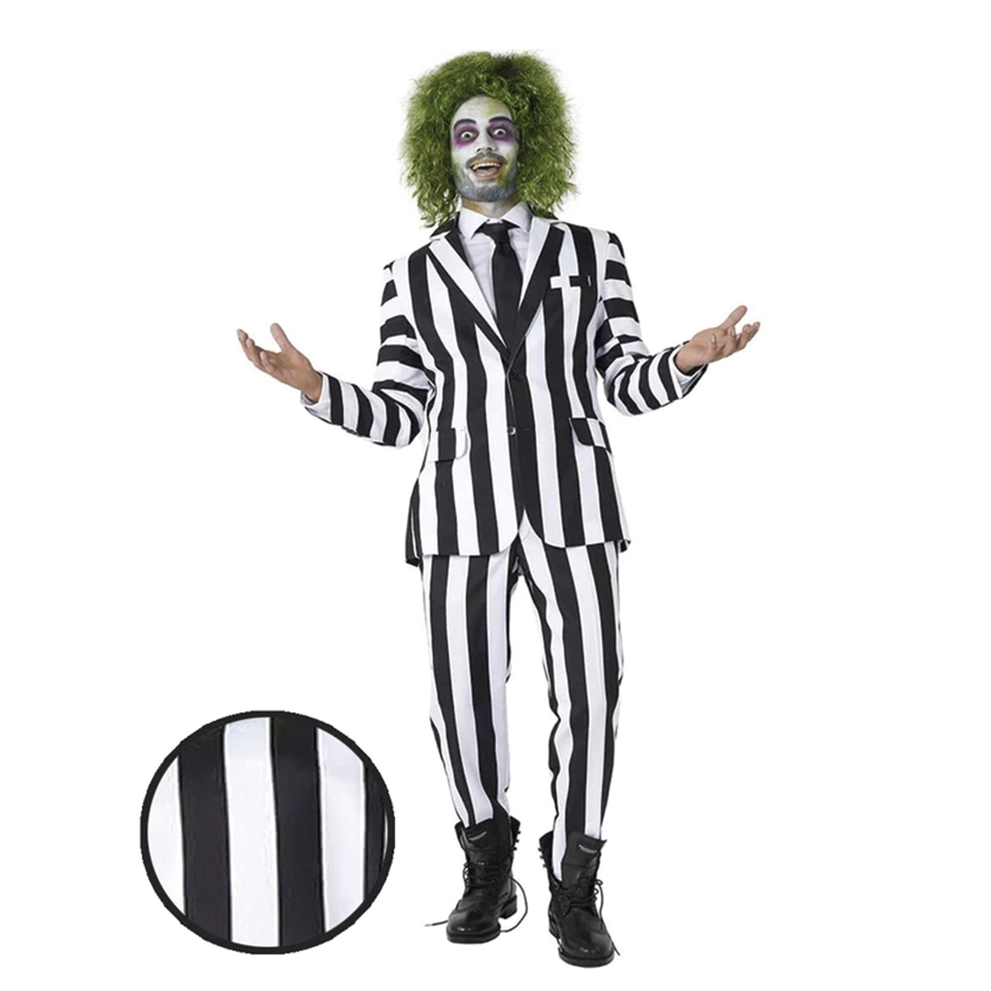 - Diseño Único: Este traje presenta un patrón de rayas en blanco y negro, emblemático de Beetlejuice, que captura su esencia caótica y divertida.