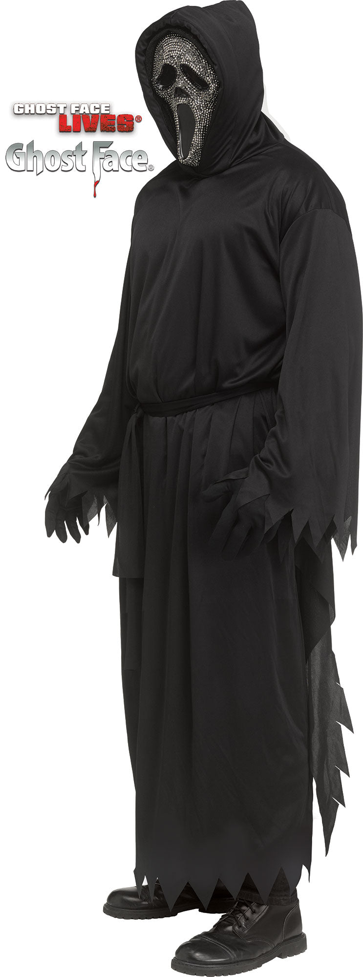 Un aterrador disfraz de Ghostface con un toque brillante gracias a su máscara con cristales rojos. Incluye todos los accesorios para un look completo y escalofriante.