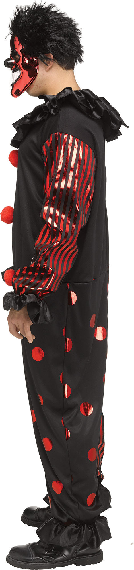 Un disfraz de payaso único y llamativo, con máscara cromada que le da un aspecto perturbador y original.